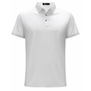 Embrace effortless sophistication with the Tranquil Thread Polo, a refined blend of classic elegance and modern design. This polo features a crisp white base, accentuated by a Greek key embroidery on the collar and sleeve cuffs, adding a touch of timeless luxury. Crafted from premium breathable fabric, it offers lightweight comfort and 4-way stretch for ease of movement. Whether you're dressing up for a casual evening out or keeping it sharp during the day, this polo is your go-to for understated style with a refined edge.