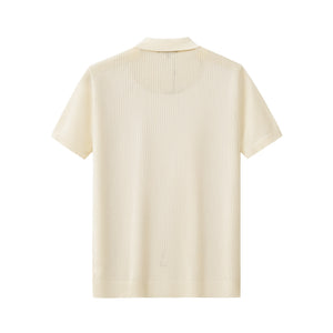 - Open-knit short sleeve polo with a button-up placket
