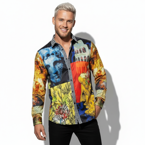 Celebrate the past with striking modern flair in the Ancient Glory long sleeve shirt by Barocco. This wearable masterpiece blends classical art with contemporary graphic design—featuring a bold patchwork of Greco-Roman sculptures, architectural landmarks, and botanical sketches rendered in vivid color blocks.