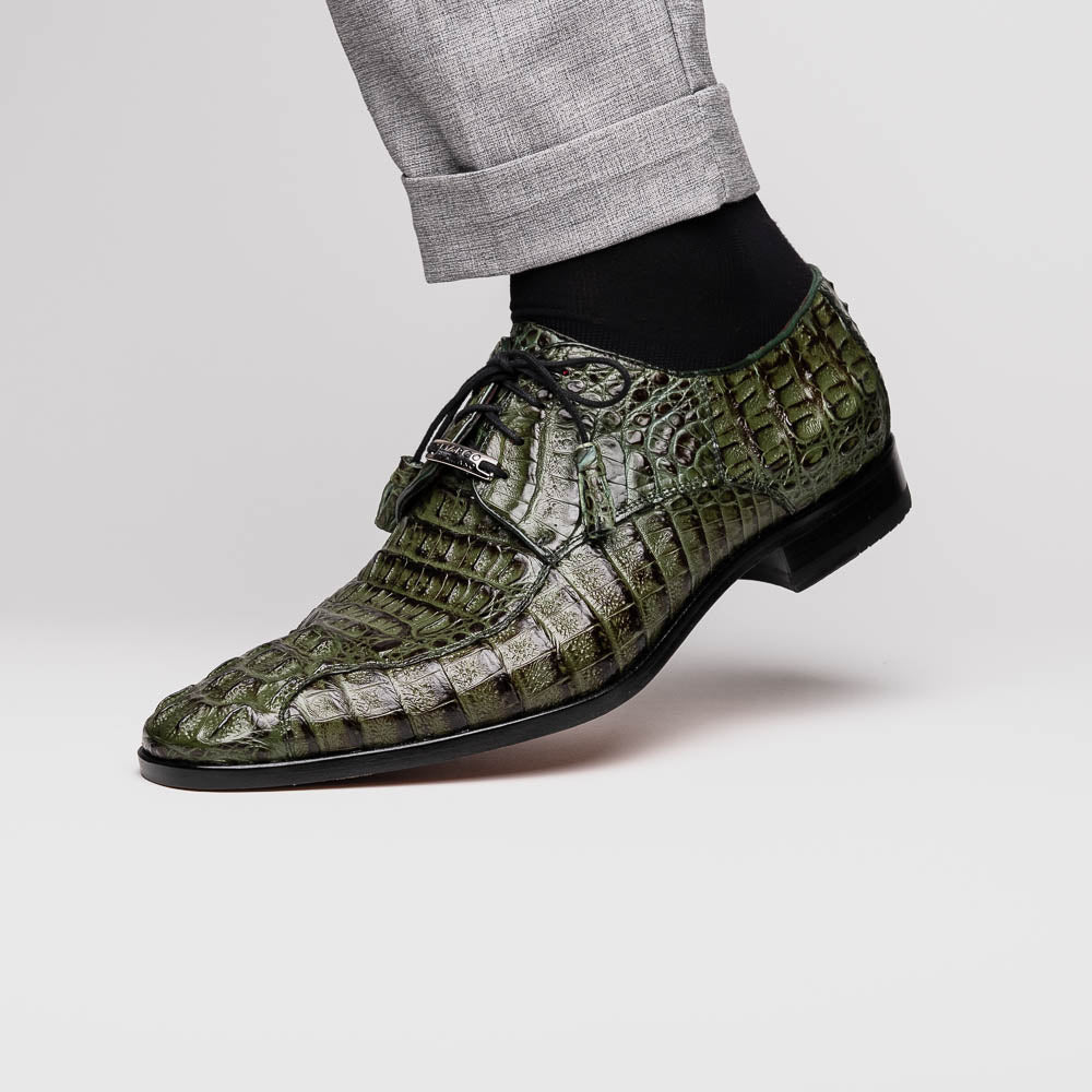 The APRICENA is our fully wrapped genuine caiman crocodile dress derby's featuring tasseled laces and a polished hand finish that makes the crocodile texture pop. Dress these up with your favorite jeans or slacks for a stunning look.