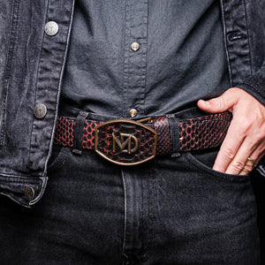 The ARKANSAS belt is a bold expression of exotic elegance, handcrafted from genuine python skin with its naturally striking texture and scale pattern. A polished antique brass buckle in Western style adds just the right amount of rugged refinement, while the full-grain leather lining—dyed to match the exterior—delivers comfort and durability with every wear.