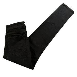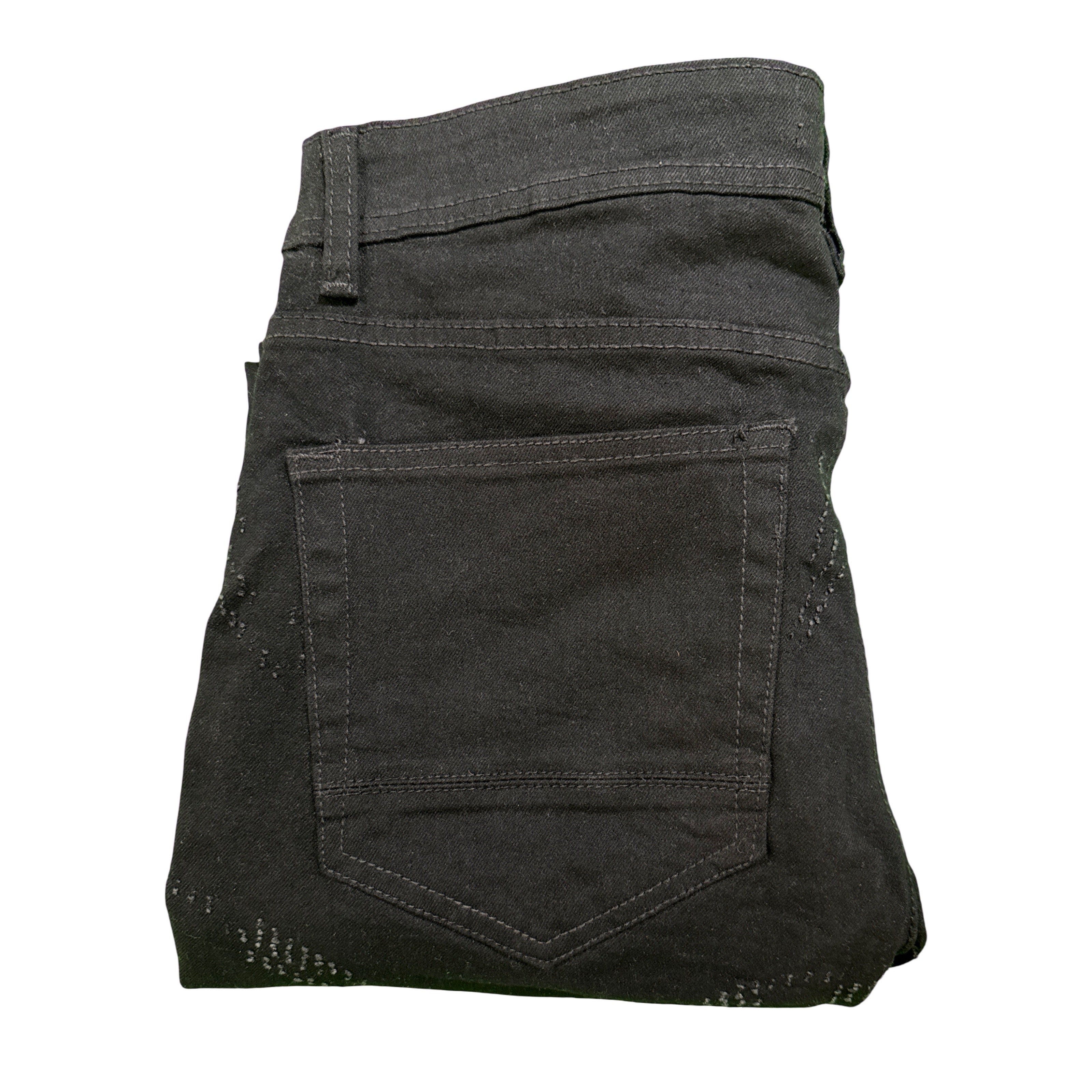 Elevate your look with these black jeans featuring a subtle tonal embroidered circle pattern woven seamlessly into the fabric. Crafted from premium stretch denim for a sleek, comfortable fit, this refined design adds texture and depth without overpowering your outfit. Perfect for pairing with statement footwear or a crisp shirt, these jeans blend modern sophistication with versatile wearability.