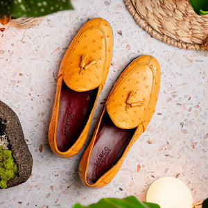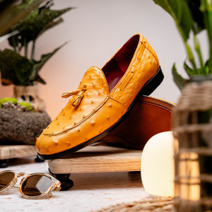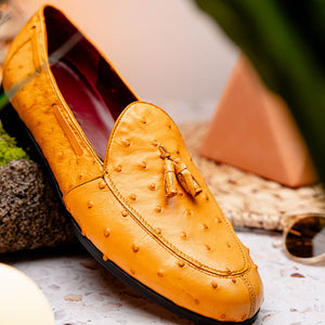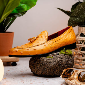 The AUBIERE is our classic fully genuine ostrich tassel loafers that have made their way as a best seller. They feature a beautiful polished hand finish, easy slip-on application, and a full leather outsole. Dress these up with your favorite jeans, slacks, or shorts for a sophisticated look.