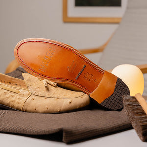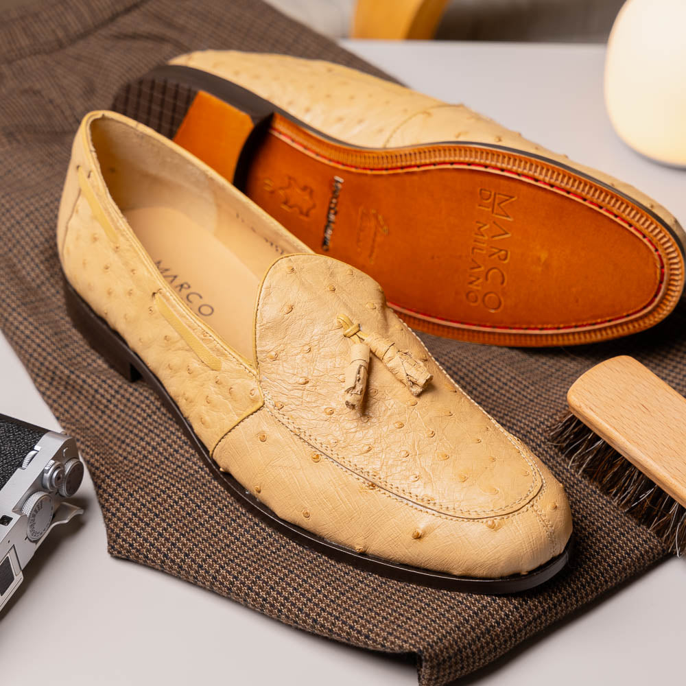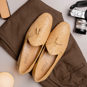 The AUBIERE is our classic fully genuine ostrich tassel loafers that have made their way as a best seller. They feature a beautiful polished hand finish, easy slip-on application, and a full leather outsole. Dress these up with your favorite jeans, slacks, or shorts for a sophisticated look.