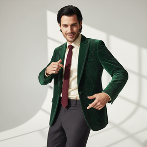 The Valent Velvet Blazer embodies opulent sophistication with its deep velvet base and intricate tonal scrollwork. Satin peak lapels and pocket detailing heighten the contrast, while its precision tailoring creates a sculpted, modern silhouette. Designed for evening affairs and bold statements, it captures Barocco’s signature fusion of luxury and edge.