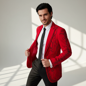 The Valent Velvet Blazer embodies opulent sophistication with its deep velvet base and intricate tonal scrollwork. Satin peak lapels and pocket detailing heighten the contrast, while its precision tailoring creates a sculpted, modern silhouette. Designed for evening affairs and bold statements, it captures Barocco’s signature fusion of luxury and edge.