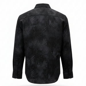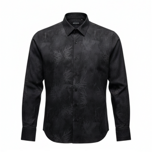 This distinguished button-up shirt combines timeless elegance with contemporary design, featuring a rich black base adorned with an intricate abstract botanical wash. Expertly tailored for the discerning gentleman, the piece showcases refined craftsmanship and attention to detail throughout. The premium fabric offers a subtle sheen and exceptional drape, ensuring a polished appearance whether worn formally or casually. Versatile enough to pair with tailored trousers or relaxed denim, this shirt serves as a cornerstone piece for any sophisticated wardrobe. An investment in quality that transcends seasonal trends and occasions.