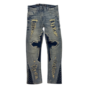 Elevate your denim collection with these striking BlackLight Blue Cross Studded Distressed Jeans, a contemporary take on classic rebellion. Featuring meticulously placed cross studs that catch the light with understated elegance, these jeans blend edgy detailing with refined craftsmanship. The distressed elements are strategically positioned to create visual interest without compromising wearability, while the rich blacklight blue hue offers versatility across seasons. Perfect for those who appreciate statement pieces that maintain sophistication, these jeans transition seamlessly from casual weekends to curated evening looks. The studded accents add dimension and personality, making them a distinctive foundation for any modern wardrobe.