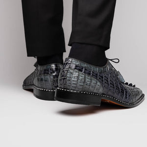The CARIBE is our stunning genuine hornback caiman crocodile dress derby's featuring a 3D crocodile scale toe box, tasseled laces, stitched outsole, and a polished hand finish that makes the crocodile texture pop. Dress these up with your favorite jeans or slacks for an out-of-this-world look.
