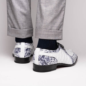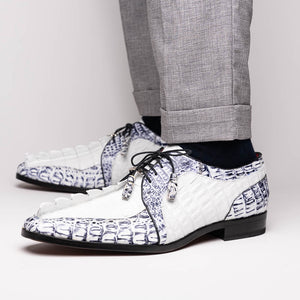 The CARIBE is our stunning genuine hornback caiman crocodile dress derby's featuring a 3D crocodile scale toe box, tasseled laces, stitched outsole, and a polished hand finish that makes the crocodile texture pop. Dress these up with your favorite jeans or slacks for an out-of-this-world look.