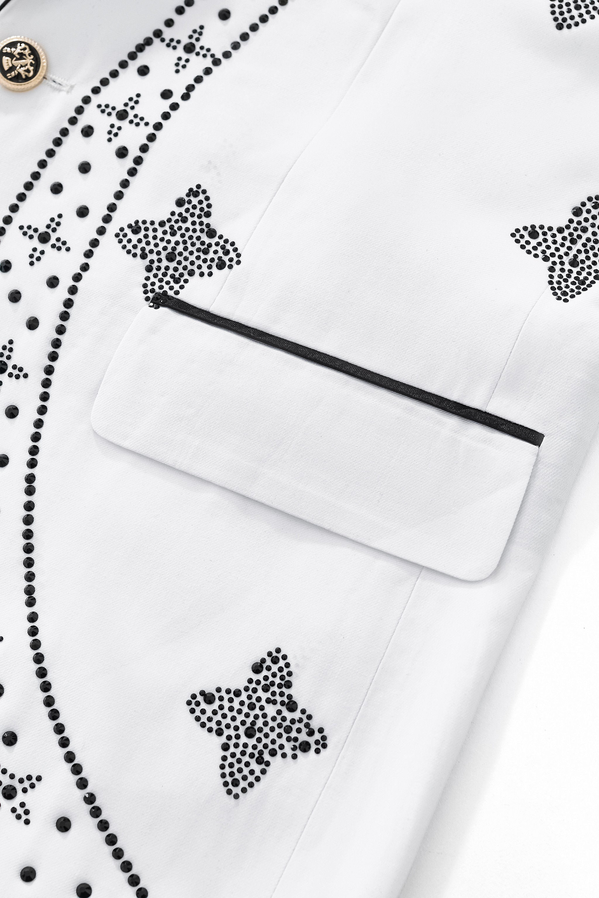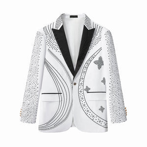 A fashion-forward blazer designed as a statement piece, defined by a tailored silhouette and intricate stone embellishment arranged in flowing patterns that deliver bold visual impact with refined confidence for elevated evening and occasion styling.