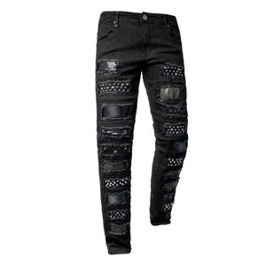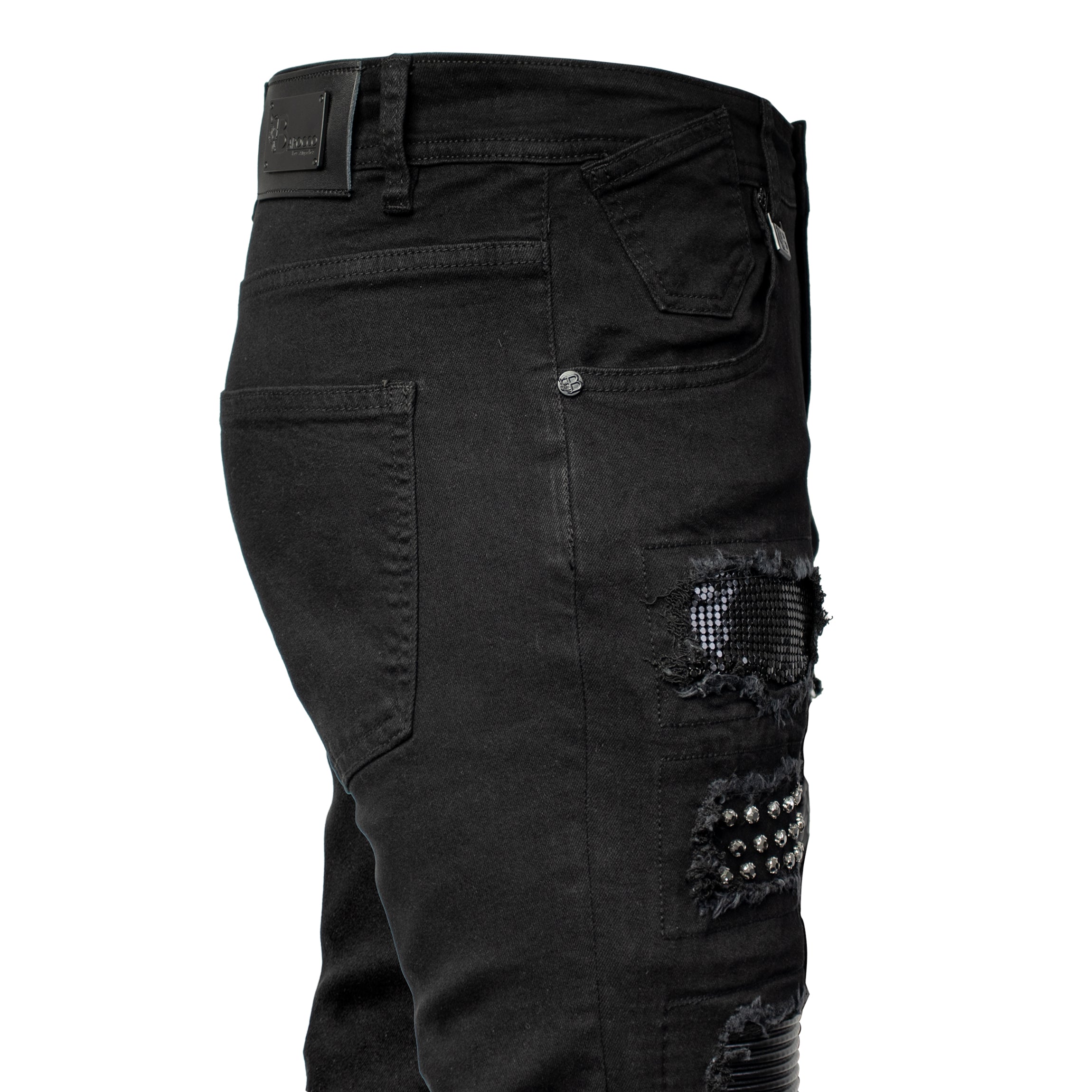 Crafted from premium stretch denim, they move effortlessly with your body while maintaining a sharp, tailored silhouette. Distressed details add rugged character, while rhinestone-backed accents introduce a refined bling effect that catches the light—and attention. The moto-style backing infuses an extra dose of edge, making these pants ideal for red carpet appearances, live performances, or upscale streetwear moments.
