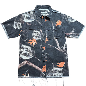 Stand out this season with the CopperRivet Skull Fall Distressed Denim Shirt—a bold blend of edge and artistry. Featuring a unique skull-themed fall print over a vintage-washed denim base, this shirt brings attitude to any outfit. Frayed details and strategic distressing give it a rugged, worn-in vibe, while the tailored fit keeps it clean and modern.