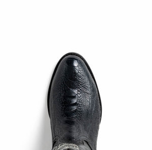 The DENVER boot delivers bold style and exotic elegance with every step. Crafted from genuine ostrich leg skin, this round-toe boot showcases the natural ridges and grain of the leather—rich in detail and unmistakably luxurious. Its deep red vamp is perfectly balanced by a black full-grain leather shaft with matching red stitching and pull tabs, bringing together contrast and craftsmanship in true Western fashion.