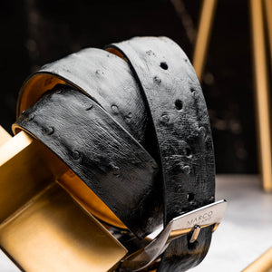 Finish your look with our genuine exotic ostrich belts, featuring beautiful antiqued hand-finishes and soft interior lining. The brushed chrome buckle features subtle Marco Di Milano branding, and it easily removable in case you need your belt trimmed to size.