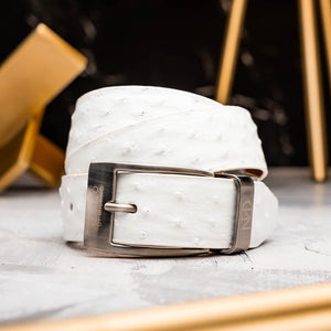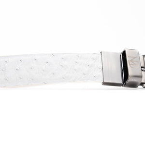 Finish your look with our genuine exotic ostrich belts, featuring beautiful antiqued hand-finishes and soft interior lining. The brushed chrome buckle features subtle Marco Di Milano branding, and it easily removable in case you need your belt trimmed to size.