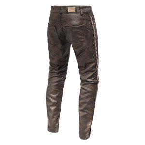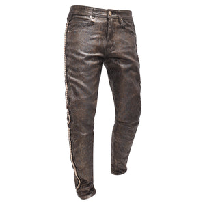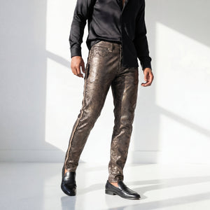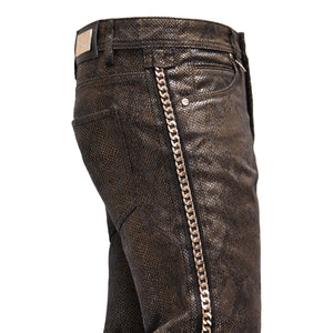 Dare to stand out with the Exotic Magic Snakeskin Jeans, designed for those who demand attention. These skinny-fit jeans blend the fierce allure of animal print with the luxury of a Cuban link chain running along the out seam, offering a touch of bling that's perfect for runway looks and red-carpet moments. The textured snakeskin pattern elevates your style, combining exotic flair with a modern edge. Crafted from premium stretch fabric, these jeans provide superior comfort without sacrificing the boldness of their design. Whether you're hitting the red carpet or owning the night, these jeans offer the perfect balance of fashion-forward appeal and wearable comfort. Feel the power of standout style with the Exotic Magic Snakeskin Jeans, designed to leave an unforgettable impression.