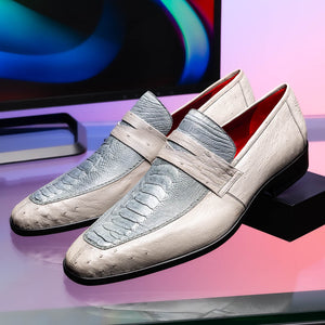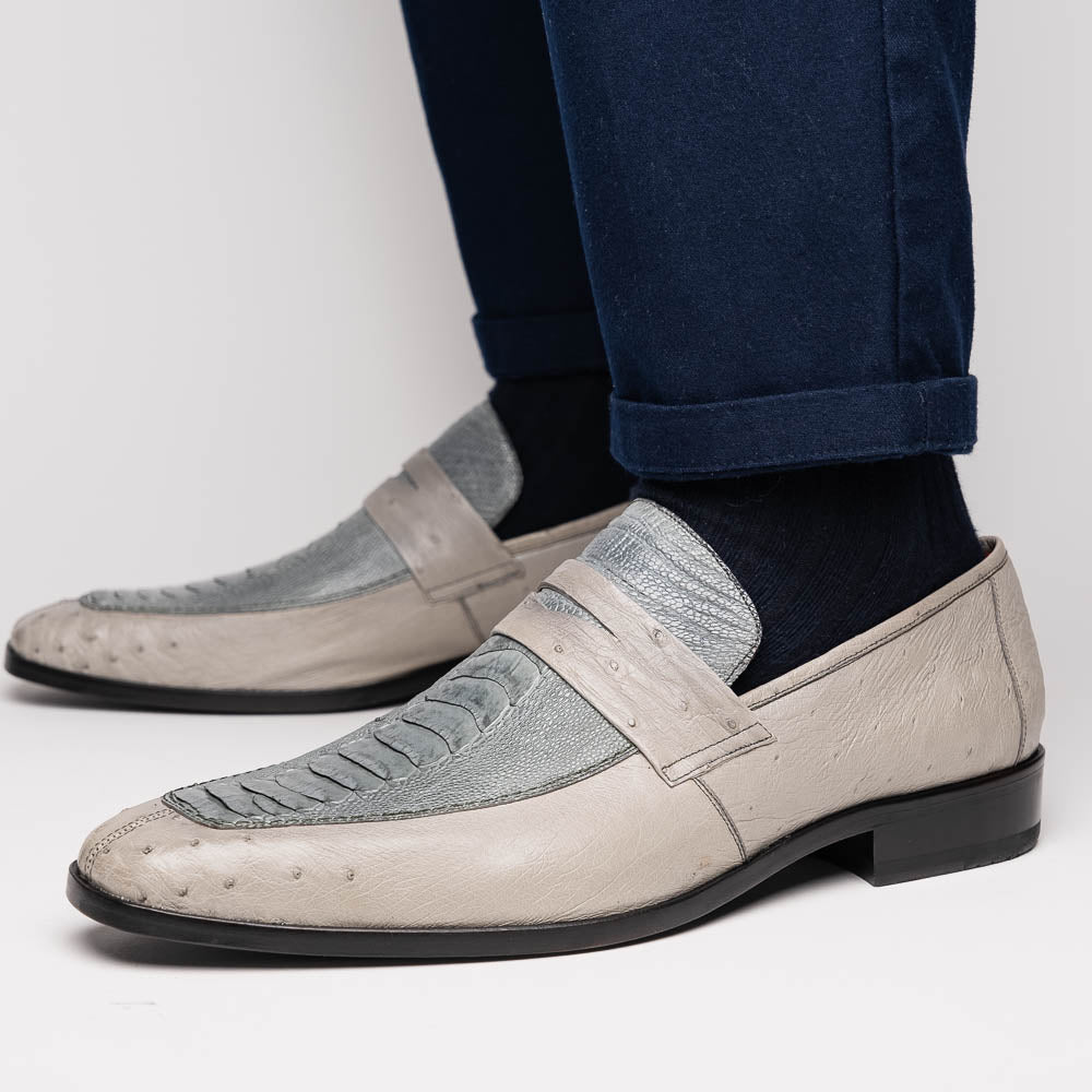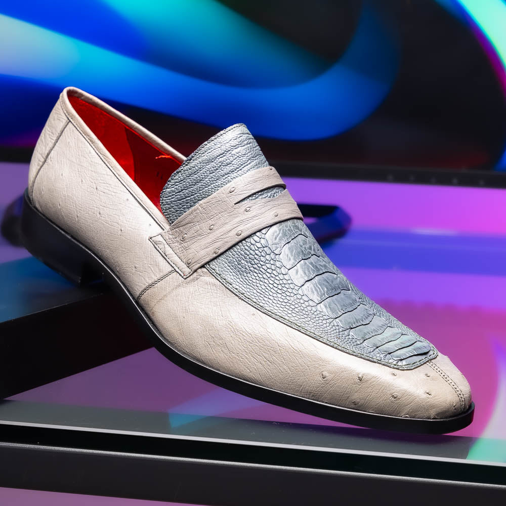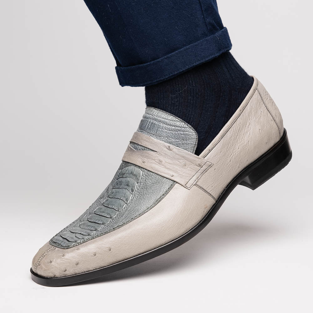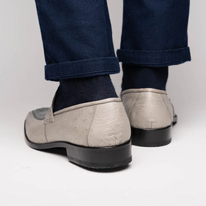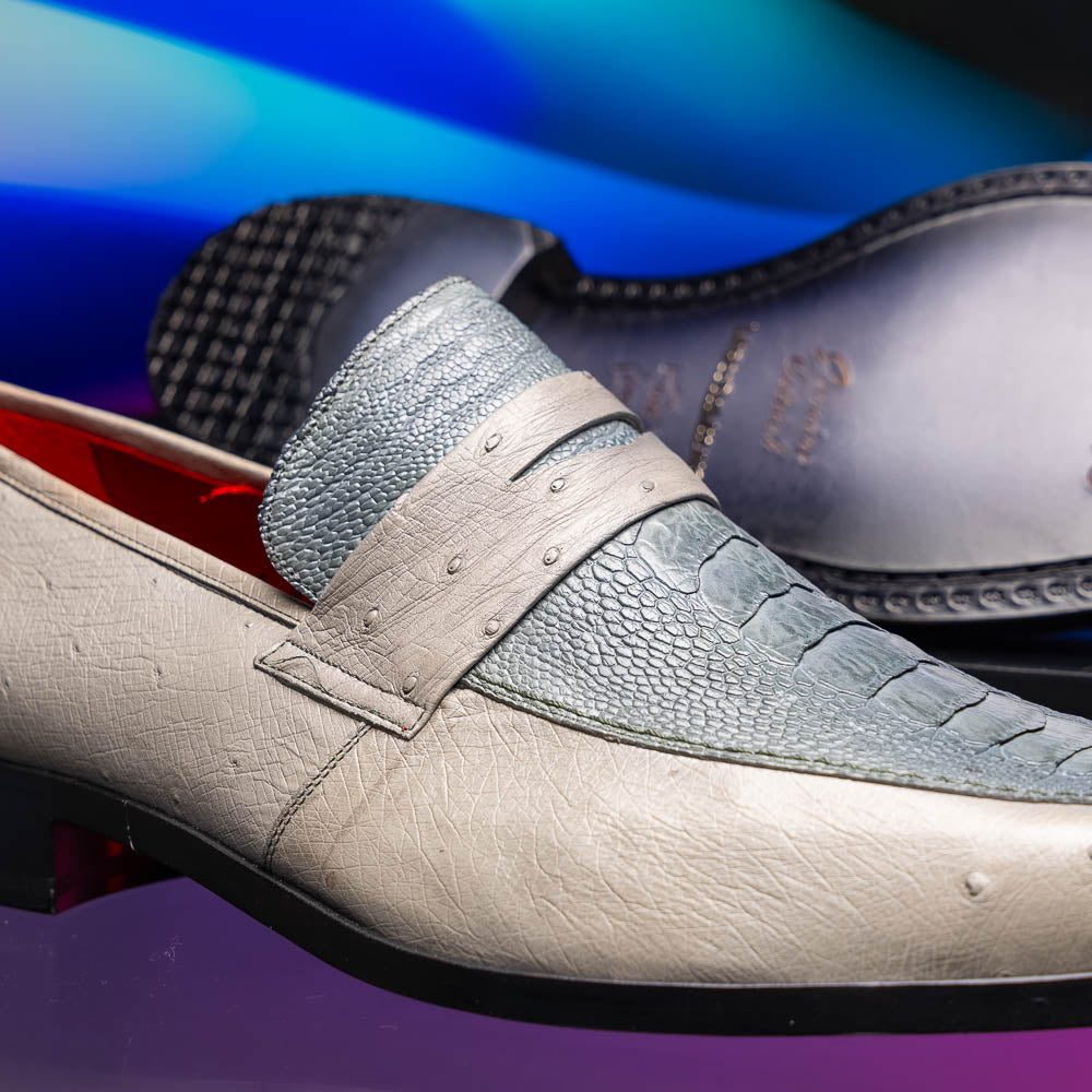 The FANGIO is our classic penny loafer with an exotic twist. It features genuine ostrich leg and ostrich quill, a unique hand finish, easy slip-on application, and a full leather outsole. Dress these up with your favorite jeans, slacks, or shorts for a sophisticated look.