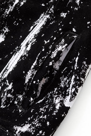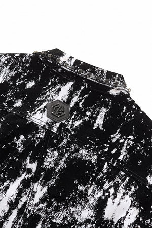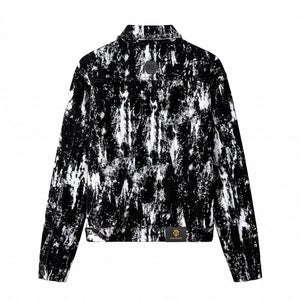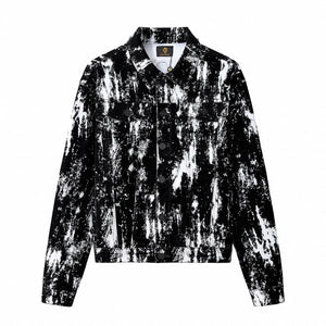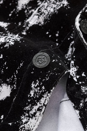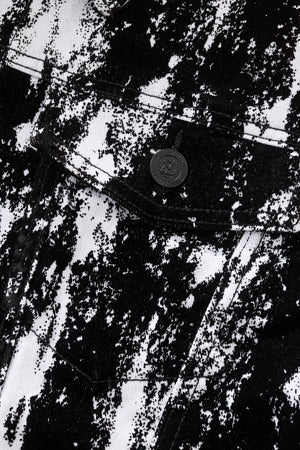 The Flocked Eclipse Denim Jkt brings an art-driven edge to a classic trucker silhouette. A bold monochrome pattern is layered with a flocked, velvet-like black surface that adds depth, texture, and contrast. Cut from stretch denim with a structured fit, it delivers modern street-lux attitude in a refined shape.