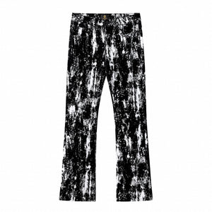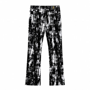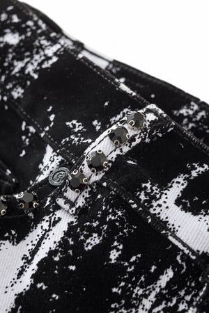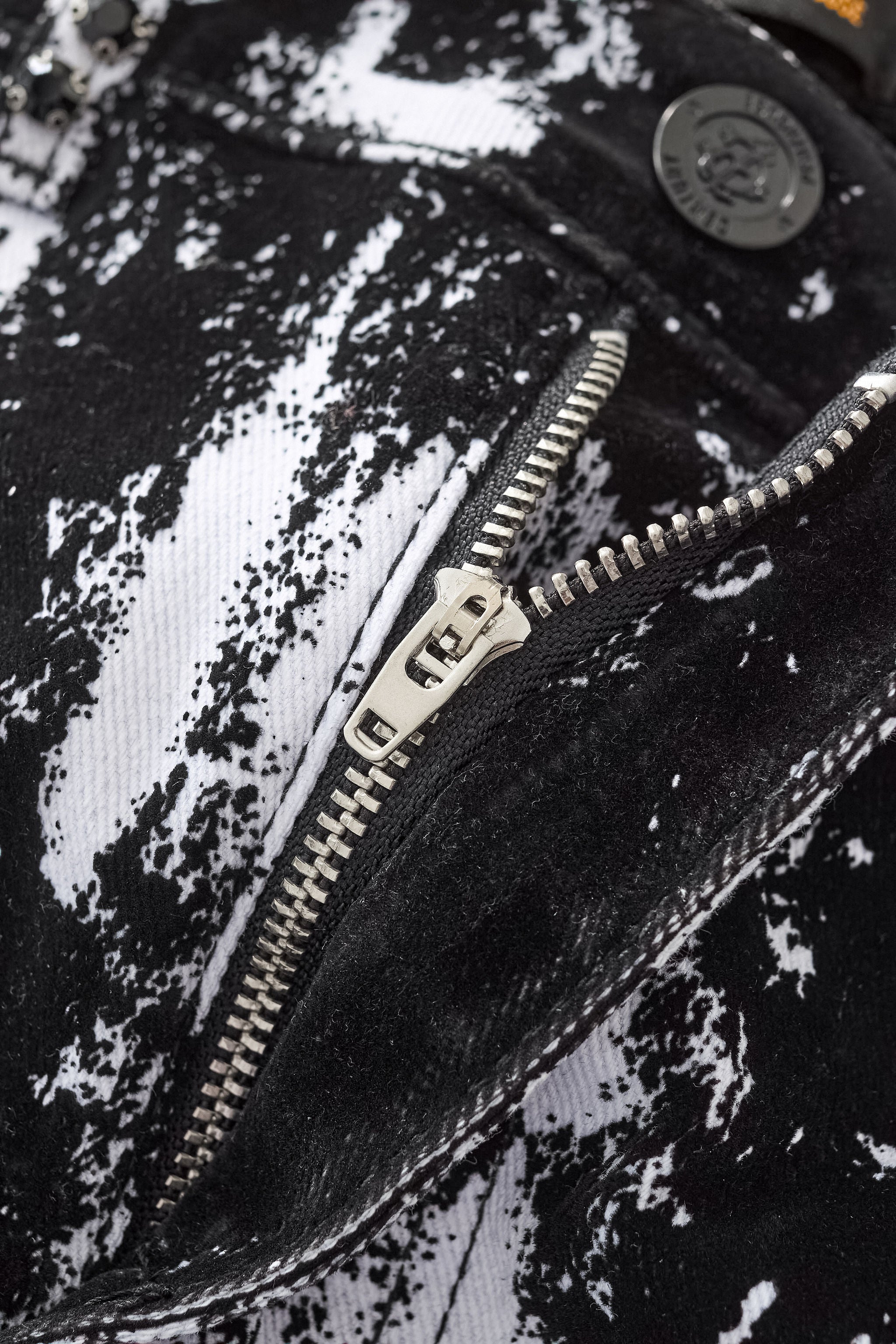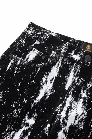 The Flocked Eclipse Denim Pant completes the look with a sharp, modern profile. Designed in stretch denim with the same monochrome pattern and flocked black texture as the jacket, it offers a clean, tailored fit that anchors the statement surface. Wear it as a full set or as a standout piece in a street-lux rotation.