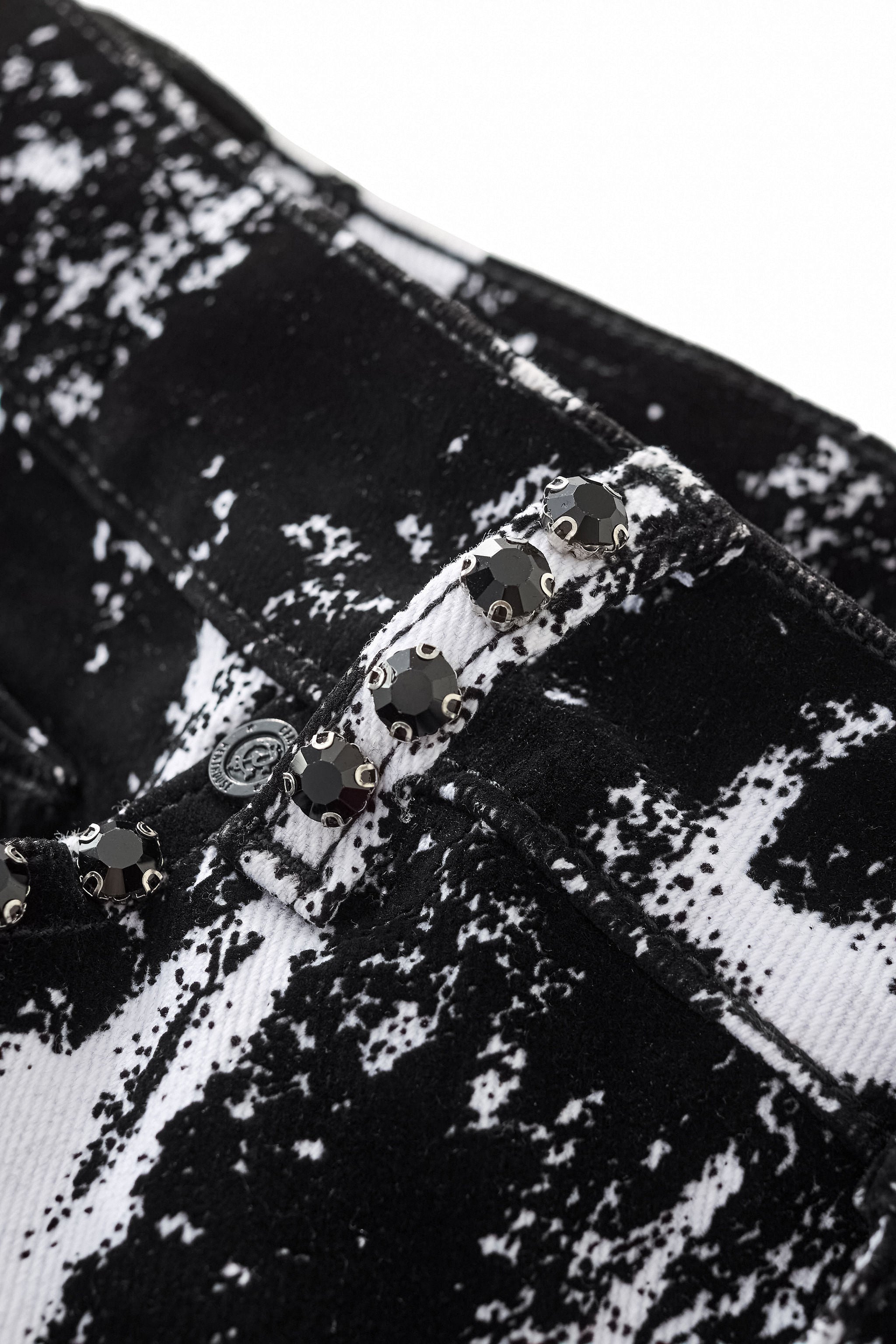 - Tailored denim pant with flocked monochrome pattern