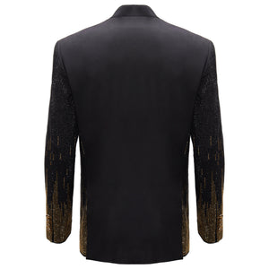 Make a bold statement with the Golden Mirage Blazer, a lavishly designed piece for those who dare to stand out. Crafted with intricate jacquard detailing and gradient crystal embellishments, it captures attention with its rich shimmer and sleek profile. The slim fit, mandarin collar, and single-button closure create a modern silhouette, while the tonal fade from black to gold evokes refined drama. Ideal for galas, upscale soirées, or high-profile performances, this blazer turns any entrance into a grand moment.