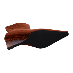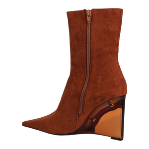 Step into modern sophistication with the Amber Edge Suede Wedge Boot. Crafted from rich rust-toned suede, this pointed-toe silhouette elongates the leg with sleek, minimalist lines. The standout feature is its sculptural wedge heel, accented with a warm amber-toned translucent detail that adds a bold architectural edge. A seamless blend of texture and innovation, this boot is designed for those who want to command attention while keeping their look effortlessly refined. Perfect for styling with tailored trousers, skirts, or dresses, it transitions seamlessly from day to night.