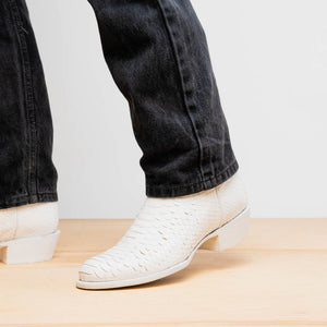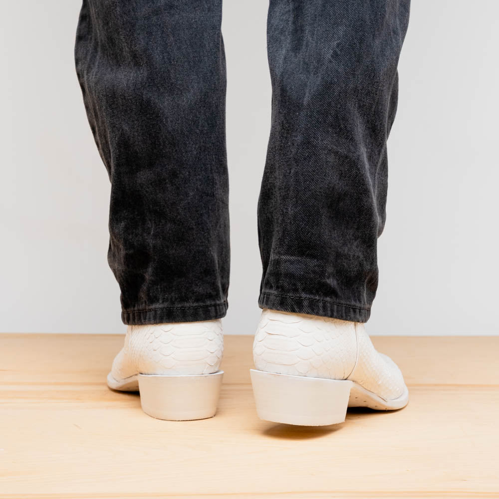 The KANSAS boot is a bold expression of authentic Western heritage elevated by luxury craftsmanship. Expertly handcrafted using genuine Python skin for the vamp and rich full-grain leather on the shaft, this piece delivers timeless cowboy attitude with a refined and modern edge. The contrast stitching and signature red interior lining add a distinctive flair—designed to turn heads whether you're on the ranch or the city streets.