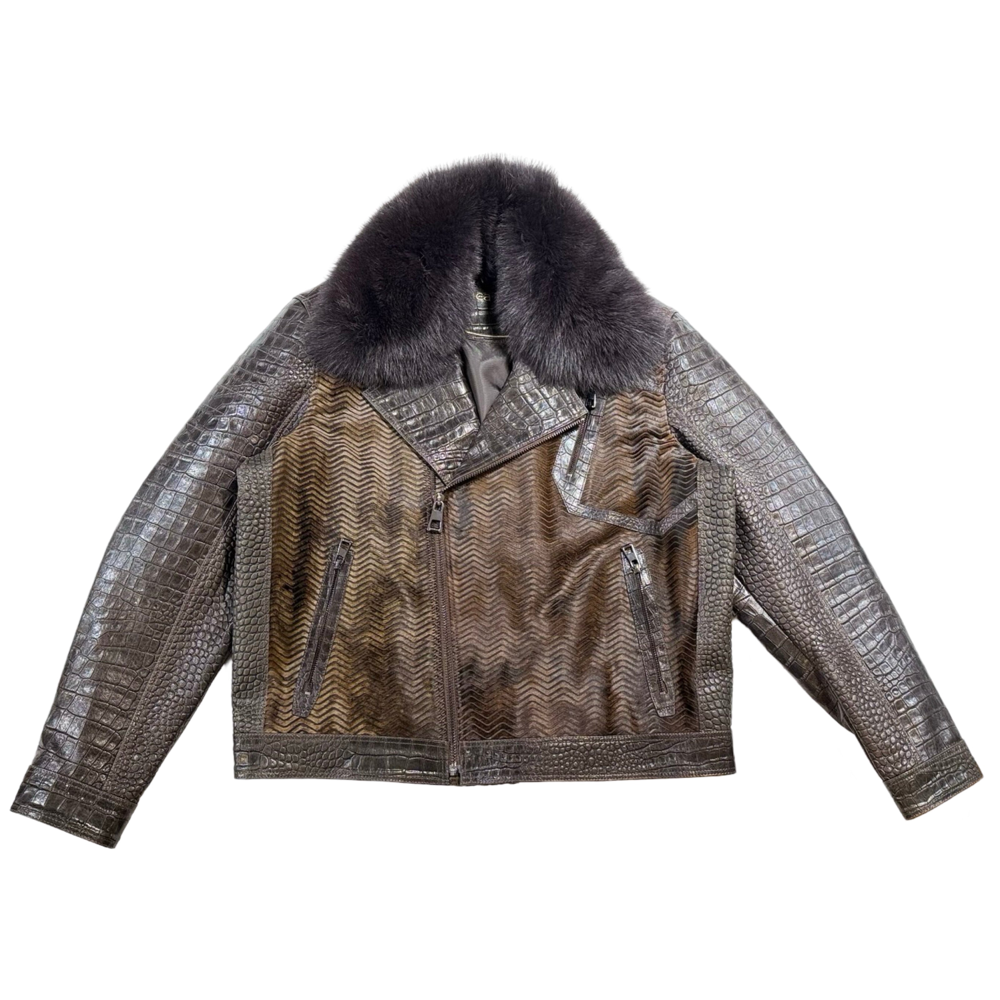 Kashani Brown Embossed Alligator & Cavallino Pony Hair Biker Jacket with Detachable Fox Fur Collar