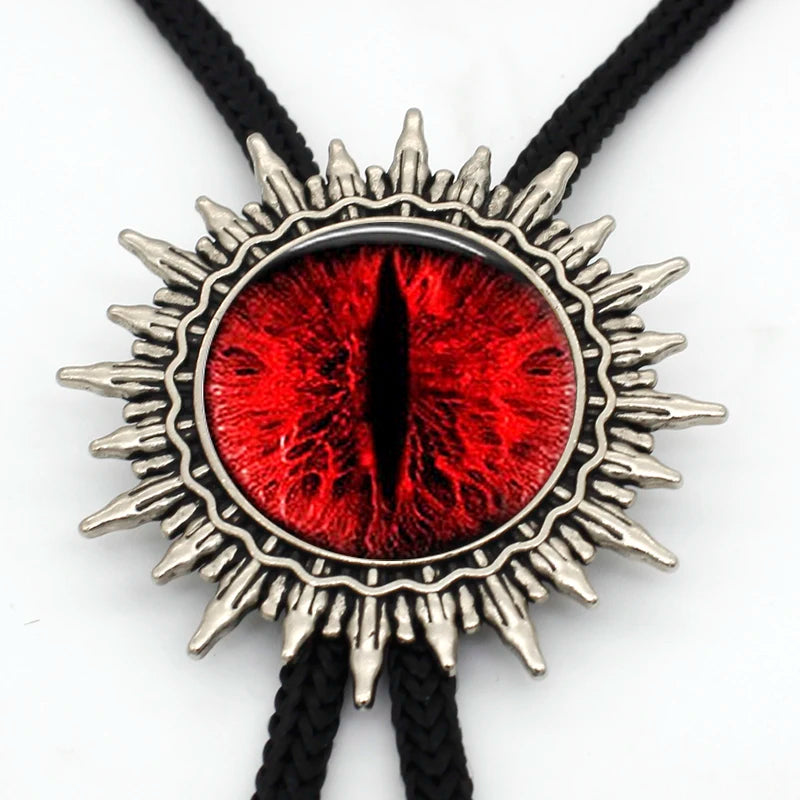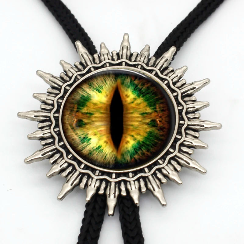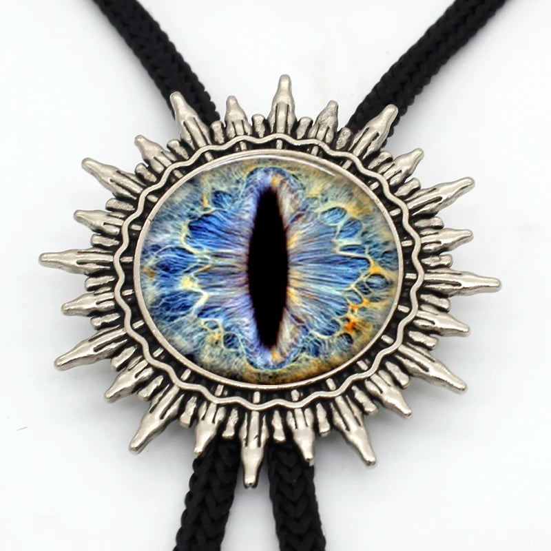 Unleash your inner legend with the Mystic Eye Western Bolo Tie, featuring a piercing purple dragon eye set in an ornate silver-tone sunburst medallion. This statement piece combines gothic mystique with Western flair—perfect for cosplay, festivals, or bold everyday style.