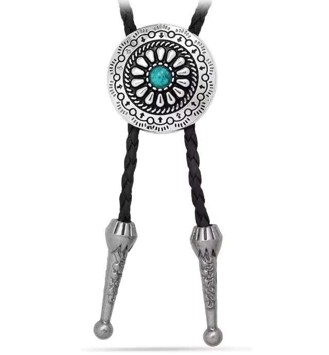 Turn heads with the timeless style of the Southwest Sunburst Turquoise Bolo Tie. Featuring a striking engraved sunburst concho design with a bold turquoise-style center stone, this piece pays homage to Western roots with a touch of Southwestern flair.