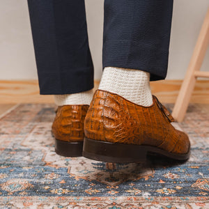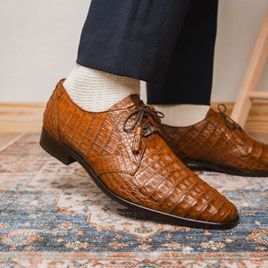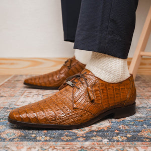 The LACIO is our fully wrapped genuine caiman crocodile dress derby's featuring tasseled laces and a polished hand finish that makes the crocodile texture pop. Dress these up with your favorite jeans or slacks for a stunning look.
