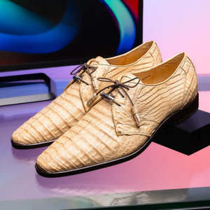 The LACIO is our fully wrapped genuine caiman crocodile dress derby's featuring tasseled laces and a polished hand finish that makes the crocodile texture pop. Dress these up with your favorite jeans or slacks for a stunning look.