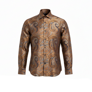 Discover refined elegance with the Leoni Bronze Paisley Button Up Shirt, a distinguished addition to any discerning wardrobe. This sophisticated piece showcases an exquisite paisley motif in warm bronze hues, creating a subtle yet striking visual presence. The traditional button-up silhouette provides timeless versatility, allowing you to transition seamlessly from casual gatherings to more formal settings. Crafted with attention to detail, the intricate paisley pattern adds depth and character while maintaining an air of understated luxury. Layer it over a crisp undershirt for polished refinement, or wear it standalone for effortless sophistication. An investment piece that elevates your personal style with enduring appeal.