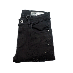 Make a bold statement with these M. Society black jeans, combining rugged distressing with a flash of rhinestone sparkle. The jet-black denim is elevated with shimmering details and raw edge rips for a modern streetwear vibe that stands out day or night.