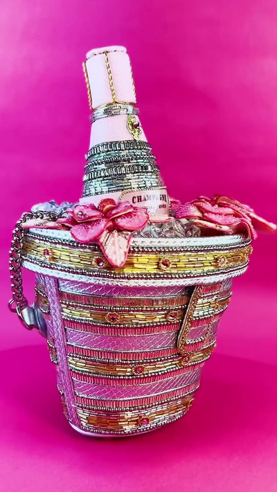 This highly collectible 3D handbag is crafted for the champagne lovers in all of us. No detail was overlooked in the design of this bag. The handbag's champagne bucket, bottle, and glasses are all hand beaded and finished with life-like resin, ice rocks.