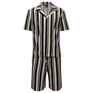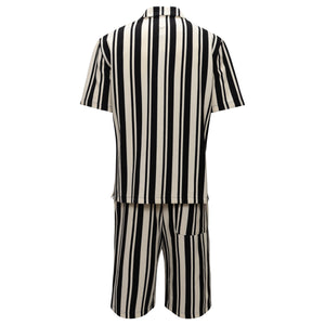 Make a statement with this striking two-piece lounge set, featuring a short-sleeve button-up shirt and matching drawstring shorts. Designed with bold black and cream vertical stripes, this set offers a retro-inspired yet modern aesthetic. Crafted from lightweight, breathable fabric, it ensures all-day comfort whether you're lounging at home, on vacation, or out for casual occasions. A perfect blend of effortless style and relaxation.