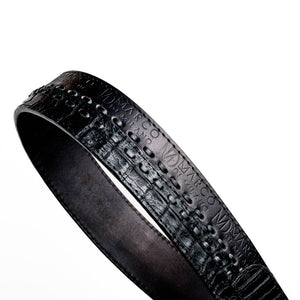 The MONTANA belt channels classic Western spirit through a bold, handcrafted lens. Made from genuine caiman crocodile skin and overlaid with rich full-grain calf leather, it features the distinctive Marco Di Milano brand stamp across the outer panel and a custom center-stitched leather channel—a nod to traditional saddlework that adds both texture and character.