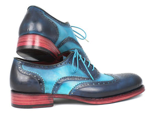 Bold and artistic, the Paul Parkman Men's Two Tone Wingtip Oxfords – Blue & Turquoise are a head-turning masterpiece in men’s footwear. These hand-painted dress shoes feature a brilliant blend of deep navy blue and vibrant turquoise, layered with rich patina and precise broguing that highlights the wingtip design. The red-tinged leather sole and matching turquoise laces complete the look with a pop of daring sophistication.