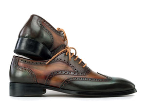 Distinctive, bold, and timeless—the Paul Parkman Wingtip Oxfords – Green Hand-Painted Calfskin are a testament to true artisan craftsmanship. Each pair is meticulously hand-painted to showcase a layered patina of deep green, chestnut brown, and subtle bronze undertones, blending heritage style with expressive modern elegance. The full brogue wingtip design, complete with intricate perforations and serrated edges, adds classic character to a bold palette.