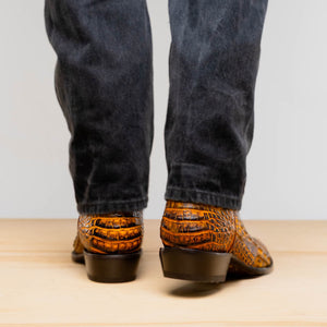 The PHOENIX boot is a refined expression of Western power and presence. Crafted with genuine caiman belly skin across the vamp and full-grain leather on the shaft, it brings a bold yet polished attitude to the cowboy silhouette. With its naturally smooth texture, subtle belly-scale pattern, and round toe finish, the PHOENIX delivers strength and sophistication in equal measure.