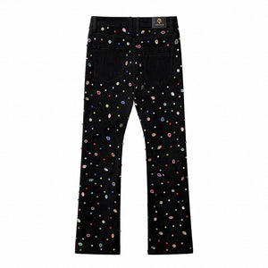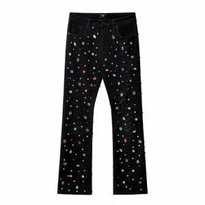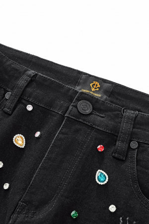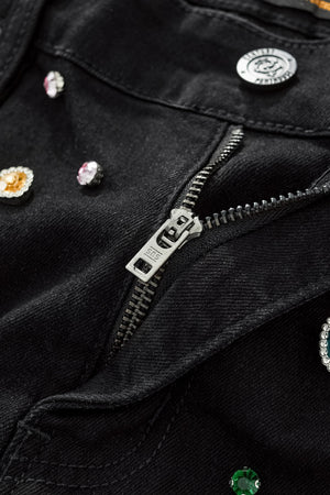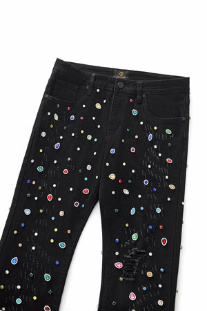 The Prism Gem Denim Pant completes the set with vivid, street-lux energy. Crafted in stretch black denim, it features scattered multicolor gem embellishments that echo the jacket for a cohesive yet standout look. A streamlined, tailored fit keeps the profile clean while the color and shine deliver a bold finish.