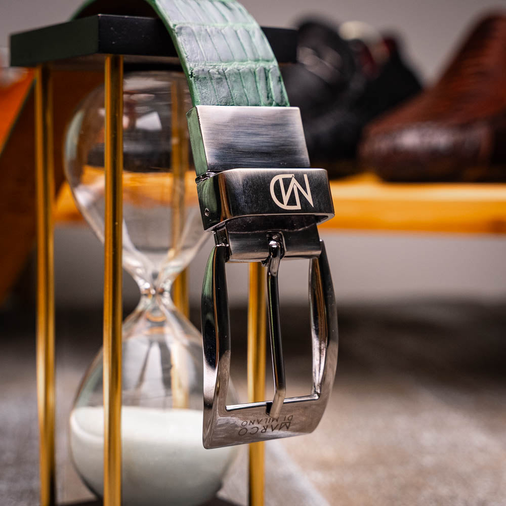 Finish your look with our genuine exotic caiman fuscus-belly belts, featuring beautiful hand-finishes and soft interior lining. The brushed chrome buckle features subtle Marco Di Milano branding, and it easily removable in case you need your belt trimmed to size.