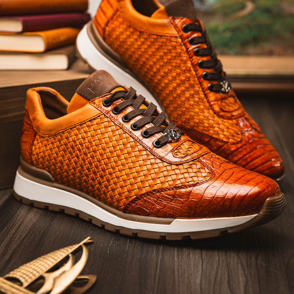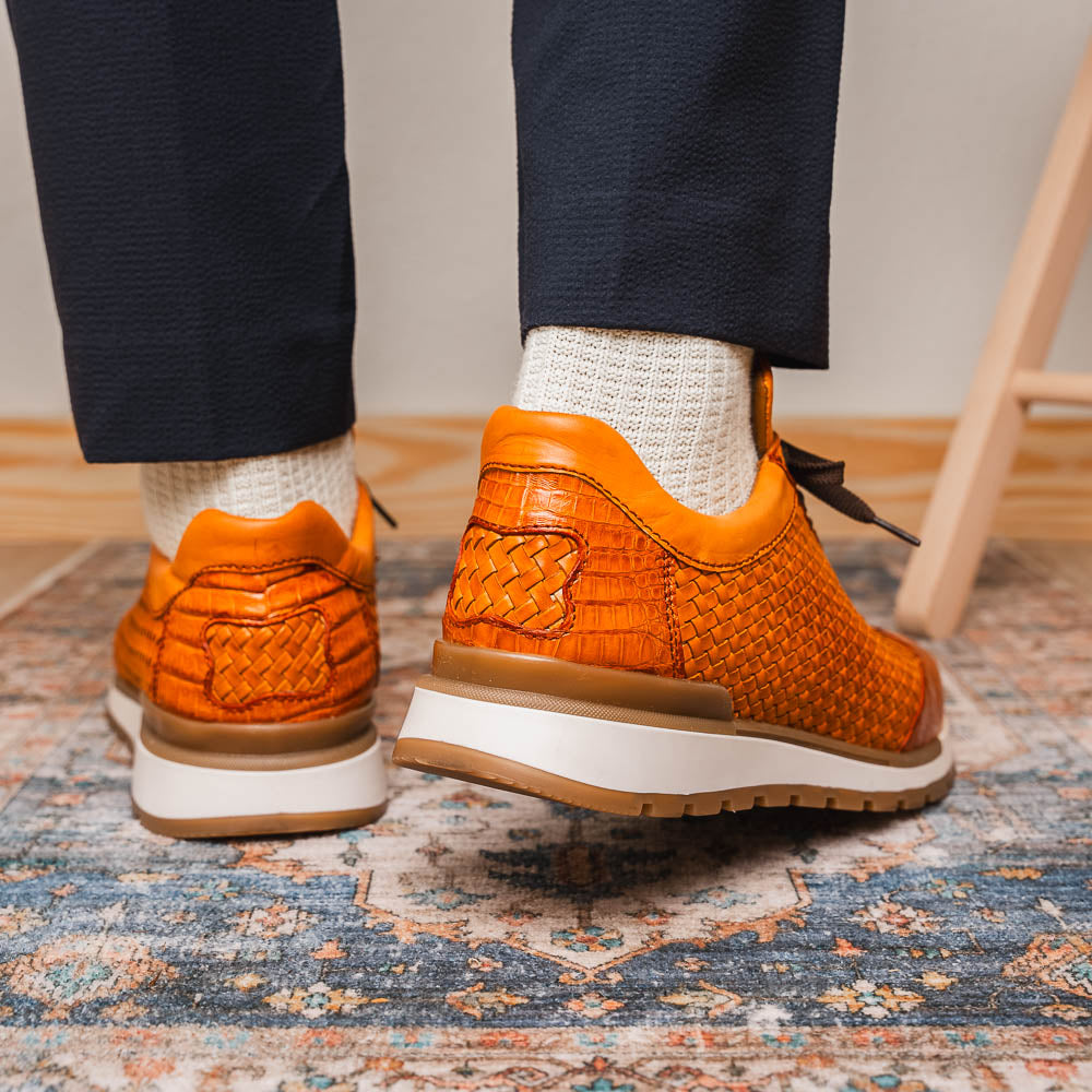 The ROMA is our woven calfskin and genuine caiman crocodile fashion sneaker boasting an bold silhouette and hand painted finish. Dress these up with your favorite slacks for a sporty dress look or pair them with jeans or shorts for a street fashion look.