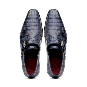 The ROVIGO is our fully wrapped genuine caiman crocodile dress monk strap featuring chrome scale textured buckle, full leather outsoles, and a polished hand-finish. Dress these up with your favorite jeans or slacks for a stunning look.