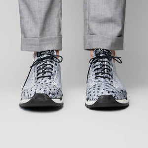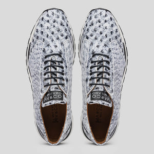 The SCANNO is our classic genuine ostrich quill fashion sneaker boasting a sporty uptempo silhouette and hand painted finish. Dress these up with your favorite slacks for a sporty dress look or pair them with jeans or shorts for a casual but clean look.