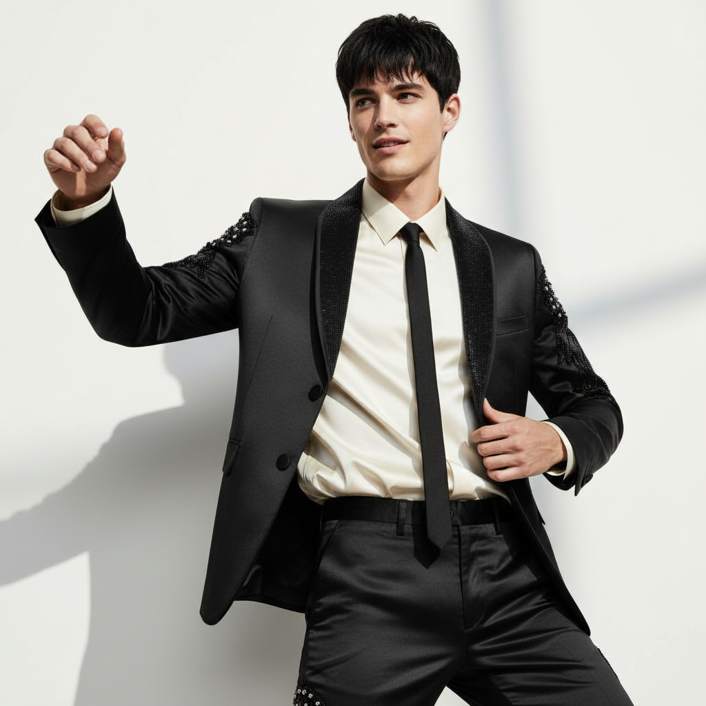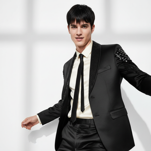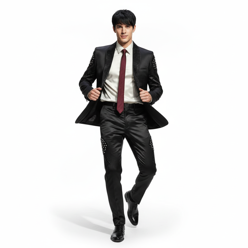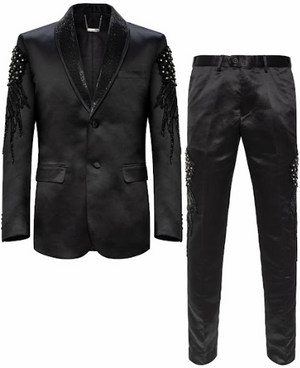 Command the spotlight in the STAR STRUT Suit Set, where high-fashion meets performance. This striking two-piece set features a sleek blazer adorned with embellishment details on the shoulders and arms, exuding a bold, bling aesthetic that captures attention. Matching dress pants mirror this statement with embellishments on the thighs and a comfortable, stretch waistband for ease of movement. Perfect for runway shows, concerts, or high-profile events.