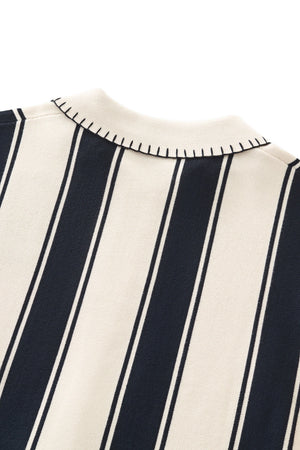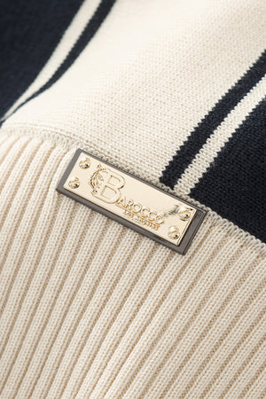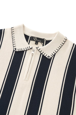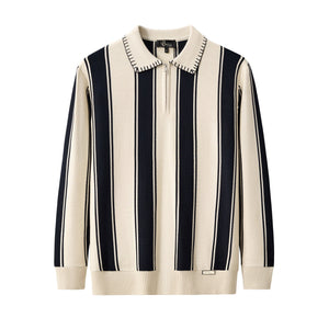 The Vanguard Stripe Knit Polo LS channels vintage sophistication through a modern lens. Crafted from a smooth viscose-blend knit, it features bold vertical stripes and contrast stitching along the collar for a refined statement. With its tailored drape and subtle sheen, this piece embodies Barocco’s signature fusion of timeless polish and contemporary edge.
